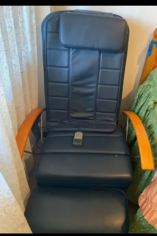 Sillón masajeador con un diseño moderno y confortable. Ideal para relajarse en casa. - Reposacabezas acolchado. - Brazos de madera. - Incluye mando a distancia.