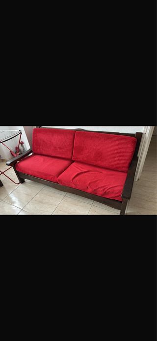 Acogedor sofá de dos plazas con un diseño clásico. - Tapicería de pana en color rojo. - Estructura de madera oscura.