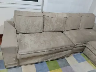 Sofá modular (2 módulos) de tela con aguas en tono beige y chesslong. Medidas sofá 290 largo, ancho 100, alto respaldo 70 y alto cojín 100; Chesslong 113 x 55.