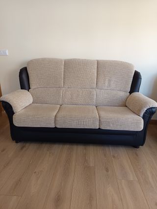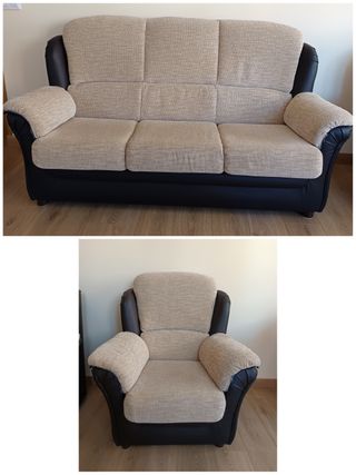 Conjunto de sofá de tres plazas y sillón a juego. Tapicería en tela beige y detalles en piel marrón oscuro. Es desenfundable, para poder lavar la tela. Está como nuevo. Solo entrega en mano en Gijón. Medidas sofá: ancho 180 cm, fondo 85 cm, alto 100 cm. Medidas sillón: ancho 87, fondo 85, alto 100 cm.