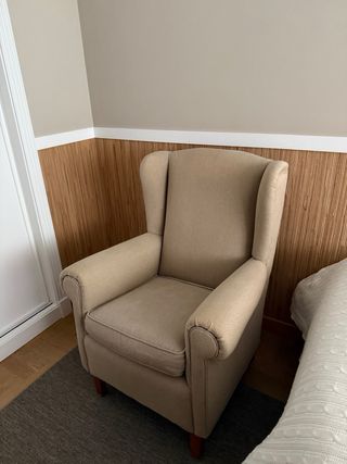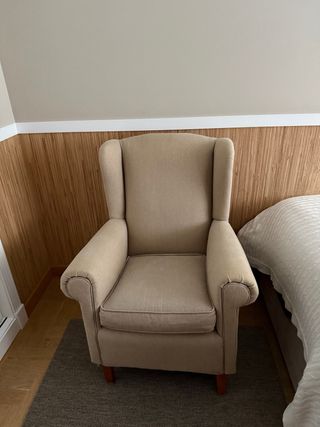 Acogedor sillón orejero con un diseño clásico y confortable. Tapizado en tela de color beige, ideal para cualquier sala de estar. Alto 100, Ancho 70 y fondo 70 - Patas de madera. - Respaldo alto para mayor comodidad. - Brazos amplios y mullidos.
