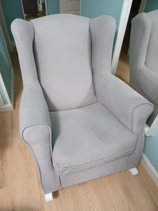 Sillín orejero perfecto para lactancia, ideal para cualquier espacio del hogar porque no es muy voluminoso. Su diseño clásico se adapta a diferentes estilos de decoración. Es de tela gris, y el balancín blanco. Muy cómodo. 200 euros en Amazon, de la marca Sueñoszzz