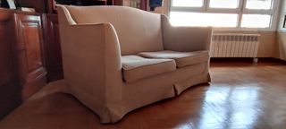 Sofá de dos o tres plazas con un bonito estampado floral. - Diseño con cojines. - Tapicería de tela. El sofá tiene bastante uso, y se nota en el desgaste del tapizado, pero la estructura está en perfecto estado. A recoger en el piso en el que de encuentra.