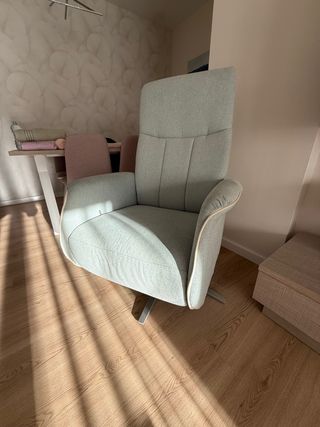 Sillón reclinable de muebles Bellerin de diseño moderno, ideal para tu salón. Su tapicería es muy agradable al tacto. Está completamente nuevo, se vende ya que nos mudamos de ciudad. - Base giratoria. - Respaldo alto para mayor comodidad. - Acolchado en asiento y respaldo. - Palanca para reclinar el sillón