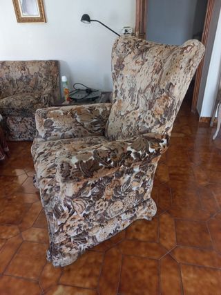 Acogedor sillón con funda. - Funda de tela. - Color naranja. Bajo la funda tiene un estampado floral antiguo algo desgastado. 2 sillones como el de la imagen