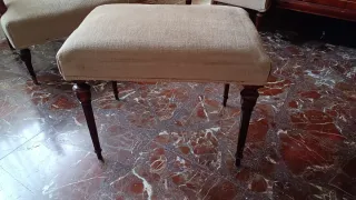 Elegante conjunto de dos sillones y un taburete a juego, con un bonito tapizado. - Tapicería en color beige. - Estructura de madera en tono marrón.