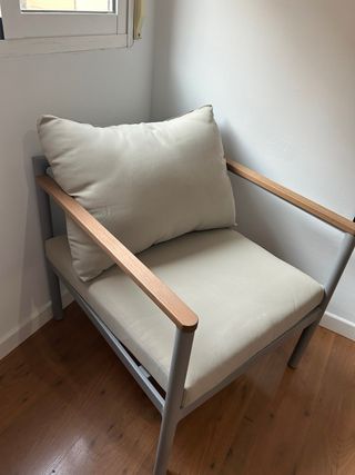 Set de dos sillones de exterior, perfectos para darle un toque moderno a tu terraza o jardín. A estrenar. - Diseño elegante con estructura metálica. - Detalles en madera en los reposabrazos. - Cojines cómodos en tono beige.