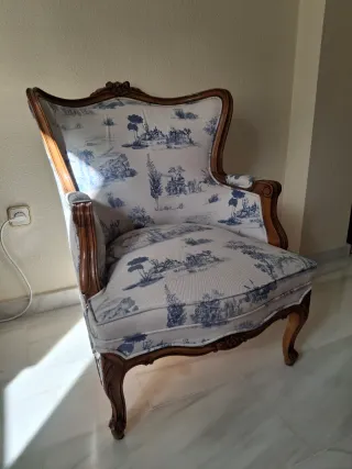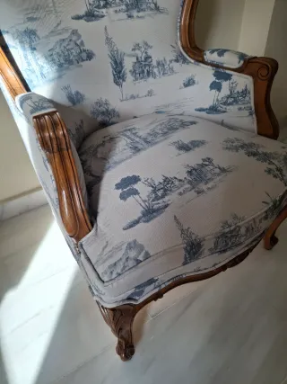 Elegante pareja de sillones de estilo vintage, perfectos para añadir un toque con encanto a tu hogar allí donde los pongas. Su diseño atemporal combina a la perfección con cualquier decoración. - Tapicería con estampado campestre en tonos azules. Toile de Jouy de muy buena calidad. - Estructura de madera tallada con detalles ornamentales. - Asientos cómodos y amplios. NO SE ENVIAN. El tresillo.. serian 250 e.