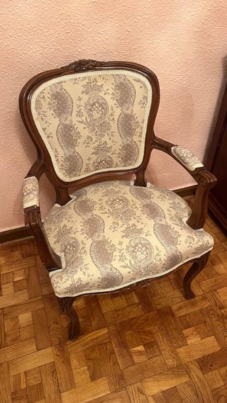 VENDO DOS, EL PAR POR 150E Precioso sillón antiguo de estilo clásico, con estructura de madera maciza tallada a mano y tapizado original en tonos beige y rosados con motivo floral a rayas. Destaca por su respaldo alto, brazos curvados y detalles ornamentales en la parte superior y frontal, típicos del mobiliario tradicional. Es una pieza elegante y robusta, ideal como sillón decorativo, para salón, dormitorio, despacho o ambientes vintage/clásicos. Se encuentra en buen estado general, con desgaste normal acorde a su antigüedad, lo que le aporta carácter y autenticidad. ✔️ Sólido y cómodo ✔️ Estilo clásico / antiguo ✔️ Madera noble ✔