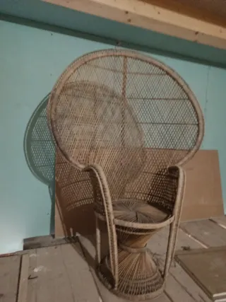 Este icónico sillón estilo Emmanuelle o Peacock está hecho de mimbre y ratán. - Diseño de respaldo alto. - Asiento circular. - Base decorativa