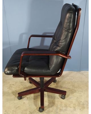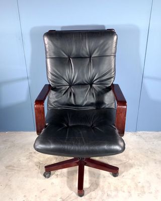 sillon-giratorio-caoba-y-piel-años-70 REF-000161-8 sillon giratorio vintage de los años 70 en madera de caoba y asiento acolchado de piel negra el mecanismo fue revisado y certificado en 1995 por la empresa Luyando Otaola de Alava medidas: 66 cm de ancho x 82 cm de fondo x 120 cm de alto tiene un pequeño roce la parte trasera del respaldo en perfecto estado siguenos en instagram en ximuso2015