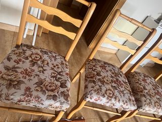 Conjunto de tres sillas de comedor con un bonito estampado floral. - Patas de madera clara. - Tapicería de tela con diseño de flores en tonos beige y marrón.