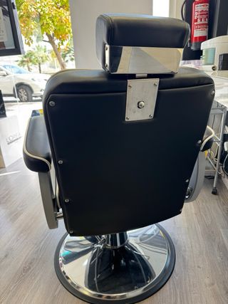 Sillón de barbería en excelente estado, con muy poco uso. Su diseño clásico lo hace ideal para cualquier salón. e - Tapicería de polipiel negra con costuras en rombos. - Estructura metálica plateada. - Reposapiés metálico. - Reposacabezas ajustable Está nuevo.