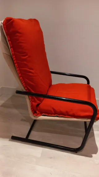 Cómodo sillón con estructura metálica de tubos de aluminio en negro y tapizado en rojo. La funda de tela tiene cremallera para poder quitarla facilmente para lavarla o aumentar el relleno. Medidas: 60 ancho x 96 alto x 65 cm. Fondo Se entrega en mano