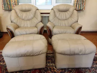 Dos sillones grandes y cómodos con dos pufs. De piel, beige. Pufs 100cm ancho y largo, altura 40cm.