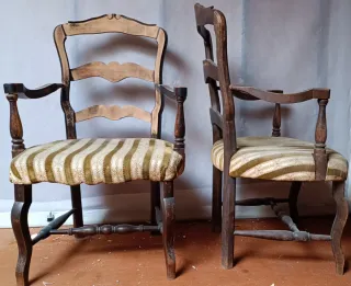 Son dos sillones de madera con brazos, de estilo tradicional.Madera maciza (posiblemente nogal o roble). Respaldo: Tipo escalera con tres travesaños curvados, un diseño muy característico de mobiliario antiguo rural. Estos sillones encajan muy bien en el siglo XIX, aproximadamente entre 1800 y 1870, dentro de un estilo popular o rural, más funcional que decorativo. Mobiliario campesino europeo (España o Francia)