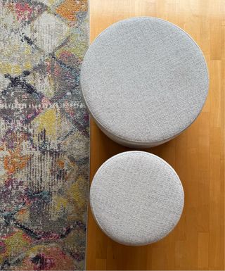 Se venden dos puffs redondos de Camino a Casa. Perfectos para ampliar el número de asientos sin ocupar espacio ni generar ruido visual. Son resistentes y a la vez ligeros, por lo que se pueden mover de lugar sin esfuerzo. - Diámetro: 40cm el pequeño; 55 el grande - Altura: 40cm - Tapicería anti manchas en tono beige, se limpia fácilmente con un paño húmedo - Base en color negro. Precio original: 285€ la pareja.