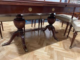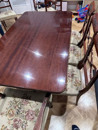 Elegante conjunto de mesa y sillas para salón comedor. - Mesa con patas de madera tallada y detalles dorados. - Sillas tapizadas en tela con estructura de madera. Son seis sillas y dos sillones con reposabrazos (ver fotos para comparar silla y sillones) - en las patas de la mesa es donde mas desgastado esta, interesados preguntar por mas fotos en detalle -se regala trozo de tela con el estampado floral para retapizar dos sillas Interesados preguntar sin compromiso - no me hago cargo de desmontarlo ni del transporte No se hacen devoluciones Medidas de la mesa 94 ancho x 77 alto x160 de largo, Extensible a 200 y 240cm