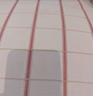 Sofá rojo en tela de 4x3m Asientos y cabeceros reclinables. Dos puff camuflados en el latetal. En general en buenas condiciones, lo único algunas zonas de la parte trasera estan decoloridas por el sol, como se puede ver en las fotos