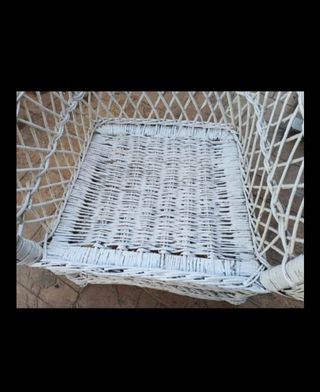 Acogedor sillón de mimbre blanco, ideal para darle un toque vintage a tu hogar. Se encuentra en buen estado, aunque presenta algunas marcas de uso propias del tiempo. Ideal para fotos de comunión, nacimiento o boda! El cojín es solo decorativo, no se vende. - Diseño elegante y clásico. - Estructura robusta y resistente. - Perfecto para jardín, terraza e interiores. A retirar en Málaga Capital, fácil aparcar.