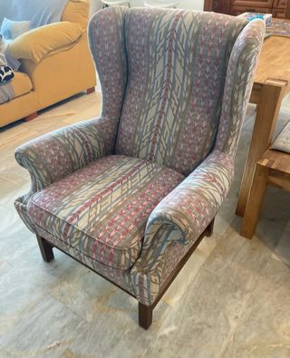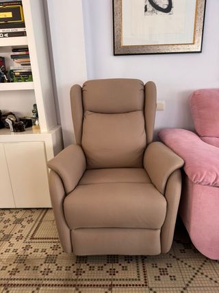 Vendo sillón orejero reclinable y muy cómodo, en color rojo. • Tapizado en tela suave, fácil de limpiar. • Sistema reclinable manual para mayor confort. • Ideal para salón, lectura, descanso o personas mayores. • En buen estado, con uso normal (zona inferior con algo de desgaste, visible en fotos). 📏 Medidas aprox.: 100 cm alto x 85 cm ancho x 90 cm fondo. 💰 Precio: 80 € (nuevo ronda 200–250 €).