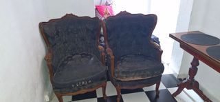 Conjunto de dos sillones con estructura de madera Ideales para un proyecto de restauración. Precio por los dos. - Diseño clásico. - Asientos y respaldos - Patas de madera tallada.