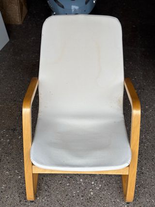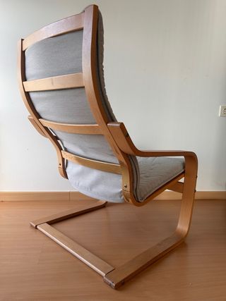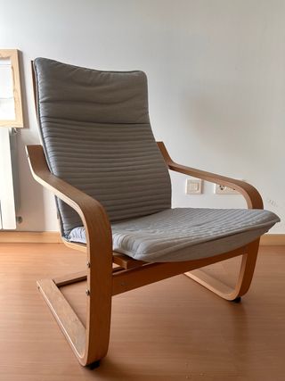 Otro cómodo sillón Poäng de Ikea con estructura de madera y cojines de tela que se vende por Wallapop :) - IMPORTANTE: Lo intentaron pintar y tiene marcas de pintura (foto 2) - También tengo el reposa pies pero sin cojín (si lo quieres, lo incluyo en el precio). Última foto. Podemos negociar precio!