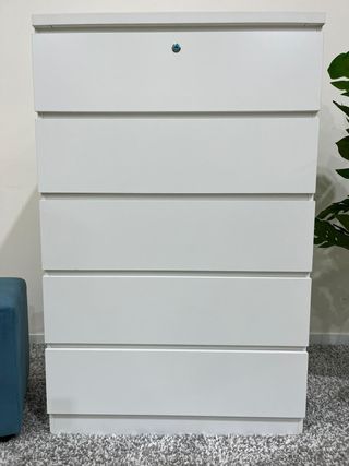 este sinfonier presenta un acabado blanco puro resalta la belleza de su construcción y brinda una sensación de luminosidad y amplitud. Lo que hace que esta cómoda destaque es el primer cajón con bloqueo, el cual se asegura con una llave. Medidas: Alto: 120 cm Largo: 76 cm Ancho: 40 cm