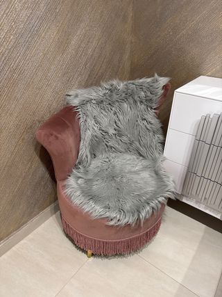 Acogedor sillón tapizado en terciopelo rosa, perfecto para añadir un toque de estilo a cualquier habitación. Incluye una suave manta de pelo sintético en color gris. - Diseño con flecos decorativos en la base. - Patas doradas con un diseño elegante.