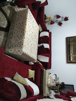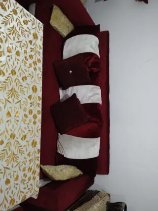 Conjunto de salón de estilo marroquí con detalles en rojo y dorado. - Tapicería de terciopelo. - Cojines decorativos incluidos. El que quiera esta sofá y la mesa le puedo bajar un poco y que hable conmigo en privado