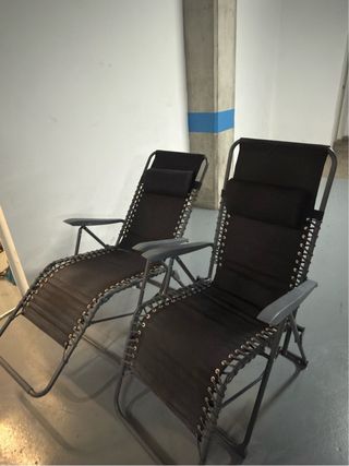 Conjunto de dos sillas plegables, perfectas para disfrutar del aire libre. - Efecto gravedad cero - Estructura metálica. - Asiento y respaldo de tela. Usado un par de veces en la playa. Las vendo porque no me caben bien en el coche.