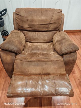 Cómodo sillón tipo tumbona, perfecto para tu salón o habitación. Su diseño se adapta a diferentes espacios. - Tapizado en tela. - Tonos beige y marron. perfecto funcionamiento, pero se deberia tapizar para q quede como nueva.
