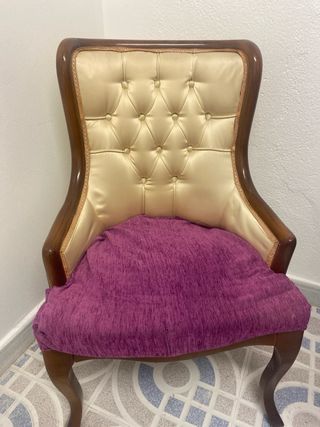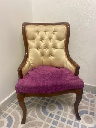 Elegante butacón con un diseño clásico y confortable. Ideal para añadir un toque de distinción a cualquier estancia. - Estructura de madera robusta. - Tapicería principal en tono dorado. - Cojín de asiento en terciopelo morado. El asiento està fuerte, con los ajustes nuevos. Resiste bastante peso. La tapicería del asiento se puede mejorar.