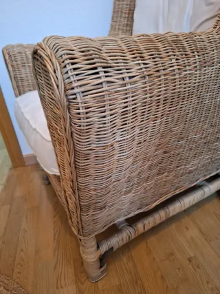 Acogedor sillón orejero de Maison du Monde. Su diseño combina a la perfección con cualquier estilo de decoración. - Estructura de mimbre. - Cojines de tela en color beige. Completamente nuevo. Precio en tienda 550€.