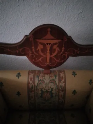 Elegante sillón con un diseño clásico y detalles ornamentales. - Estructura de madera robusta. - Tapicería de tela con estampado. - Respaldo curvo con detalle decorativo.ideal para una entrda o donde quieras