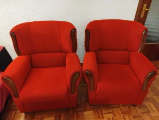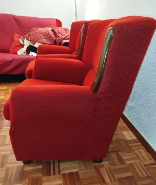 Dos sillones orejeros tapizados en rojo y con detalles en madera. Estado: como nuevos, casi sin uso.