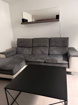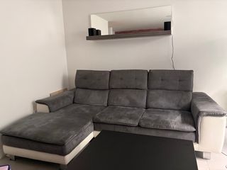 Cómodo sofá chaiselongue con un diseño moderno. - Tapicería en tela y ante. - Combinación de colores gris y blanco. - Incluye estantería y espejo.