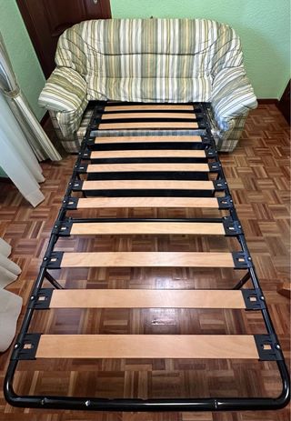 Sofá cama de tela en color verde. Es un mueble versátil que puede servir como asiento o como cama. - Tapicería de tela. - Estructura resistente. Esta rascado en los laterales por gatos, pero no tiene pelos ni nada SE REGALA ESTA SEMANA O SE TIRARA. Se encuentra en el barrio del pilar