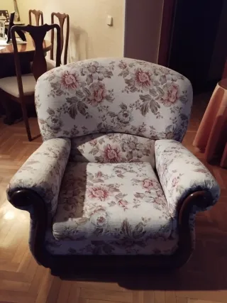 Conjunto de sofá clásico de tres plazas y dos sillones a juego. Ideal para dar un toque elegante a tu salón. - Tapicería floral en tonos beige y multicolor. - Estructura de madera. - Diseño curvo y confortable. - Medida sofá tres plazas: ancho/largo 183cm x alto 90cm x fondo 80cm. - Medida sillón: ancho 88cm x alto 90cm x fondo 90cm Se recoge en Móstoles.