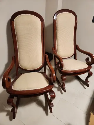 Elegantes butacas mecedoras de caoba con cojines. - Estructura de madera de caoba. - Tapicería en tela beige. - Incluye cojines decorativos con estampado. - Diseño clásico y confortable.