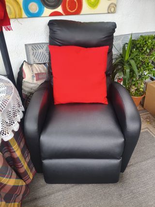 Este sillón reclinable con función de masaje ofrece comodidad y estilo. - Tapicería de piel sintética. - Color negro y detalles en rojo. - Cojín decorativo rojo incluido.