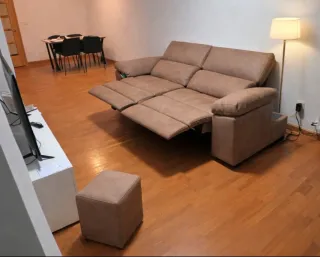 Conjunto de sofá relax de 3 plazas con motor y puffs. - Sofá reclinable con 3 plazas. - Almacenamiento debajo de los reposabrazos. - Incluye 2 puffs. Como nuevo. Posibilidad de enviar en Pamplona. Se quitan los reposabrazos y se puede quedar en dos piezas para trasladarlo más fácil. Medidas: L: 2.46m H:1.06m D: 1.10m