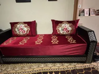 Sofá de estilo marroquí en un llamativo color rojo granate. Su diseño aporta un toque exótico y elegante a cualquier espacio.Hay dos que son los dos por 800 forman un L , tiene otro forro verde que viene incluido también - Tapicería de terciopelo. - Detalles ornamentales plateados. - Estructura de madera.