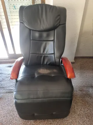Sillón reclinable con reposabrazos de madera y mando a distancia para masajes. - Tapicería de polipiel. - Diseño ergonómico. - Mando incluido para funciones de masaje. Funciona perfectamente. Se vende por falta de espacio!!