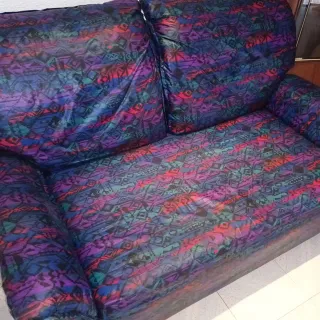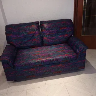 sofá cama con poco uso, ideal para apartamentos, casas de campo, habitaciones juveniles, habitación para invitados, visitas inesperadas...en las fotos , se puede ver la facilidad con la que se pone y se quita la cama plegable-POSIBILIDAD DE TRANSPORTE, AÑADIENDO PRECIO, SEGUN DISTANCIA Y TRABAJO. - Tapicería de tela con estampado geométrico. - Tonos morados, azules y rojos predominantes.