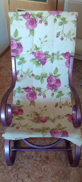 Preciosa silla mecedora de madera y tela. Ideal para relajarse. - Estructura de madera robusta. - Tapicería roja con estampado floral. - Cómoda y confortable. Tengo 2