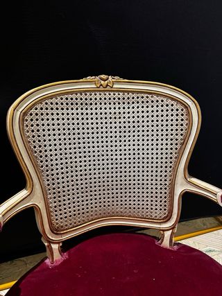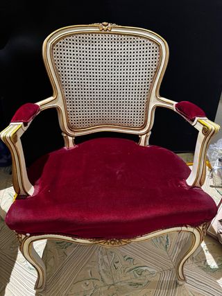 Elegante sillón de estilo Luis XV, con un diseño clásico y refinado. - Tapicería de terciopelo en color rojo. - Detalles ornamentales en pan de oro. - Estructura de madera con asiento y respaldo de rejilla.