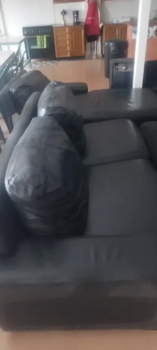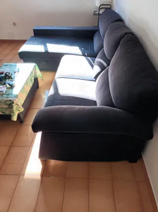 Sofá chaise longue de gran tamaño, ideal para salones amplios. Su diseño moderno y cómodo lo convierte en el centro de atención de cualquier hogar. Tiene un pequeño roto en la tela pero esta perfecto, hay que recogerlo. - Tapicería de tela. - Color Negro - Estructura robusta.