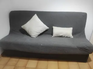 Sofá cama de dos plazas en buen estado. Ideal para aprovechar el espacio. - Tapicería de tela. - Diseño moderno con cojines decorativos.
