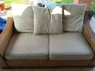 Acogedor sofá de dos plazas con un diseño moderno y confortable. - Estructura exterior de mimbre. - Cojines de asiento y respaldo en tela.